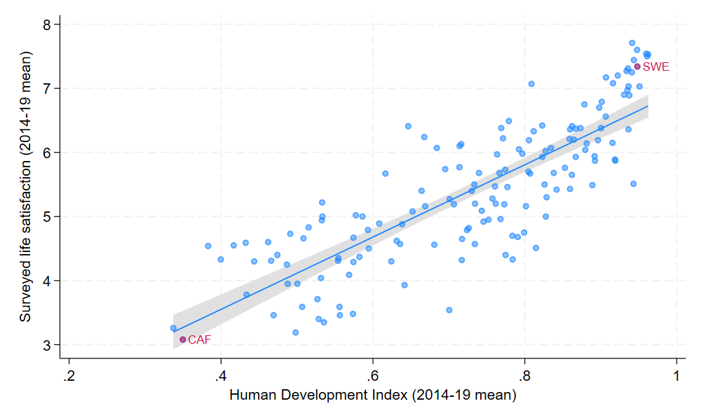 The chart shows a clear positive correlation (r=0.82). There’s variation about the line of best fit, which is inevitable in social science research. It probably reflects noisy data as well as the fact that some things other than development contribute to life satisfaction. Nevertheless, countries with higher levels of human development have much higher average surveyed life satisfaction. The UN’s Human Development Index doesn’t include a measure of human rights, but when I added a standard measure into a multiple regression, both variables were clearly positively correlated with life satisfaction.4 It’s not just me projecting. People in more developed countries are happier with the lives they live. Development is, in short, real and meaningful.